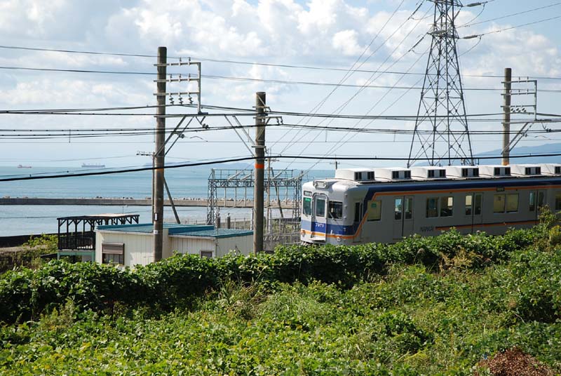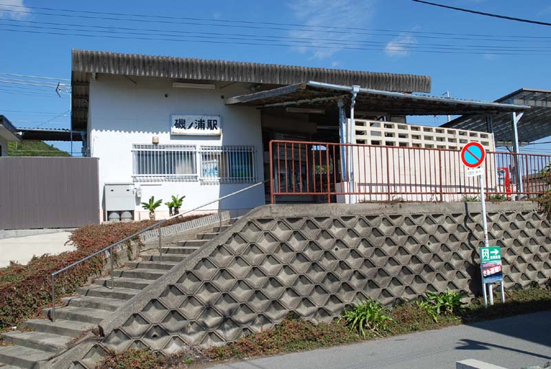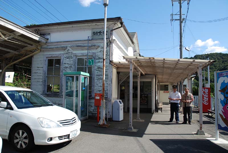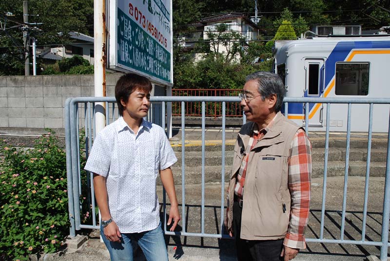 加太駅の助役さんとボーカルの梶川、駅の改札で「君待つ加太へ」が 放送されていました。